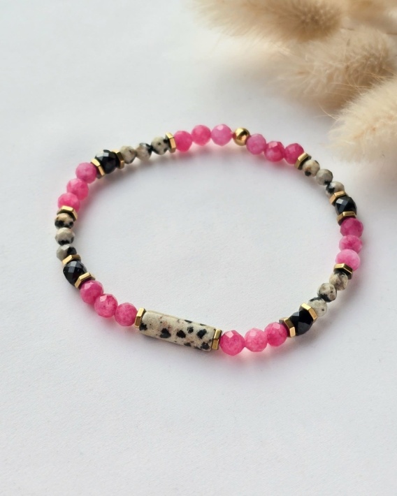 Poznaj wyjątkową bransoletkę z kamieni naturalnych na gumce, która łączy subtelny design z energią minerałów. Starannie dobrane kamienie o średnicy ok 4mm – różowy turmalin, jaspis dalmatyński oraz złoty hematyt – tworzą harmonijną kompozycję idealną na co dzień i na specjalne okazje.