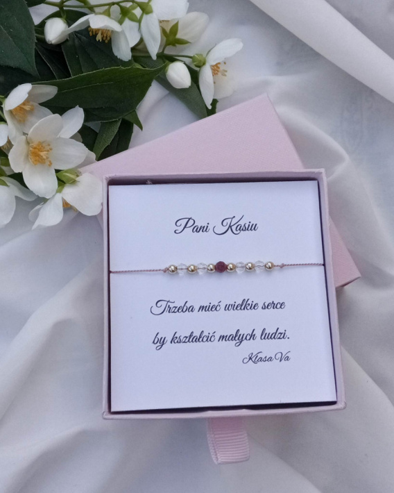 Bransoletka to wspaniały prezent dla nauczycielki czy to na zakończenie roku szkolnego czy na Dzień nauczyciela, piękna dedykacja dopełnia całości. Uhonoruj i podziękuj nauczycielce za jej pracę i trud nauczania i podaruj jej tą cudną bransoletkę z naszą dedykacją lub swoją własną.