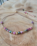 Bransoletka na jedwabnej nici stworzona z naturalnych kamieni kolorowego turmalinu i złotych hematytów, posiada stoper ze stali chirurgicznej za pomocą którego można dowolnie regulować długość bransoletki.