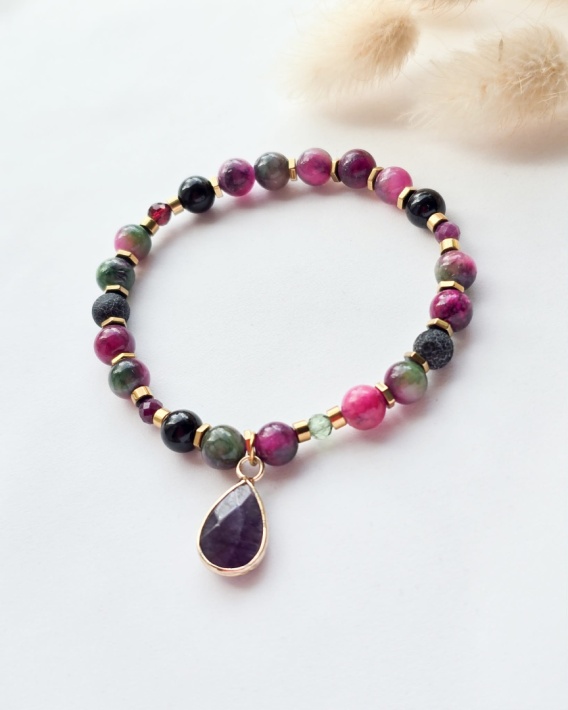 Bransoletka „Piwonia” z kamieni naturalnych – turmalin, agat, kyanit, rubin, granat i ametyst