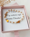 Bransoletka została wykonana z naturalnych kryształów górskich, które od wieków są cenione za swoje oczyszczające właściwości i subtelny blask. Dzięki nim bransoletka emanuje elegancją i delikatnością. Dwa złote srduszkaz hematytu symbolizuje miłość, troskę i wdzięczność, jakie chcesz przekazać Matce Chrzestnej.
