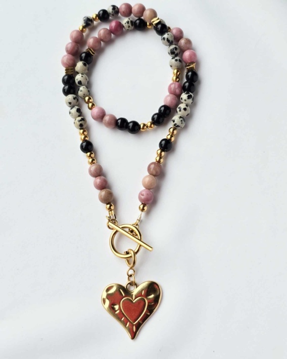 Delikatny, a zarazem energetycznie silny naszyjnik wykonany z naturalnych kamieni: jaspisu dalmatyńskiego, czarnego turmalinu i rodonitu. To wyjątkowe połączenie minerałów, które łączy w sobie ochronę, równowagę emocjonalną i radość życia. Idealny dla osób poszukujących harmonii, spokoju i pozytywnej energii w codziennym życiu.