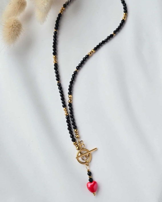 Centralnym elementem naszyjnika jest ceramiczna zawieszka w kształcie czerwonego serca. Intensywna czerwień kontrastuje z czarnymi kamieniami, przyciągając wzrok i nadając całości wyjątkowo zmysłowy charakter.